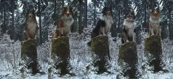 "Sitz!" auf Baumstümpfen. Von links nach rechts: Aron, Belana, Anders, Anjin und Arabelle.